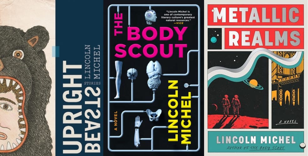 I’m the author of three books: the genre-bending story collection Upright Beasts, the science fiction noir novel The Body Scout, and the satirical-autofiction-meets-space-adventure novel Metallic Realms.