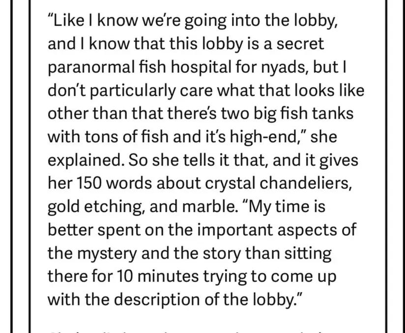 This is a good illustration of what Chiang was getting at, I think. Here, the artist is openly outsourcing their choices. It’s a strange mindset for many I’d imagine. Why write about paranormal fish hospitals if you don’t find them worth thinking about for even a measly 10 minutes? But mostly this is an author admitting they don’t have a vision or anything they wish to communicate. They want to put a product on sale in as little time as possible. The individual parts are irrelevant. For an artist who cares about their work, the first 20 minutes of a film, the dialogue in a novel, the upper half of a canvas…. these are all parts of a whole. They aren’t filler. They’re opportunities. A description of a setting isn’t just something to get through or even merely a space to create evocative images. It’s also a place to reenforce themes, add atmosphere, deepen character, and so on.
