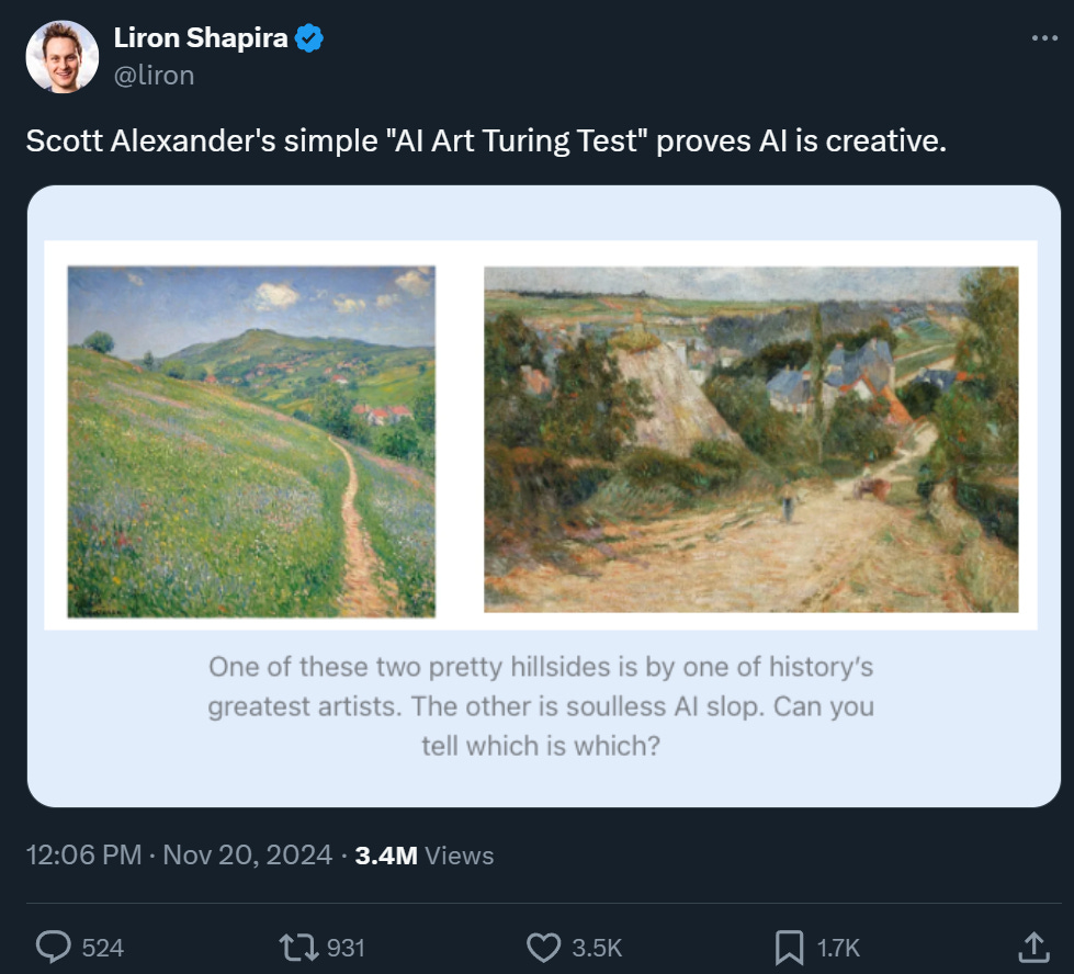 Part of the problem of all these gimmicky tests is they rest on a belief that art or anything should be judged without context. That subject knowledge, understanding of process, and so on are irrelevant—actually maybe a detriment—to proper appreciation. Alexander complains AI critics don’t judge merely on “impulse connecting with the actual content of the painting in front of you.” But why on earth would “impulse connection” be a more important way to judge art than knowledge of the form, understanding of process, or hell even just actual time spent with the image beyond the first impulse?