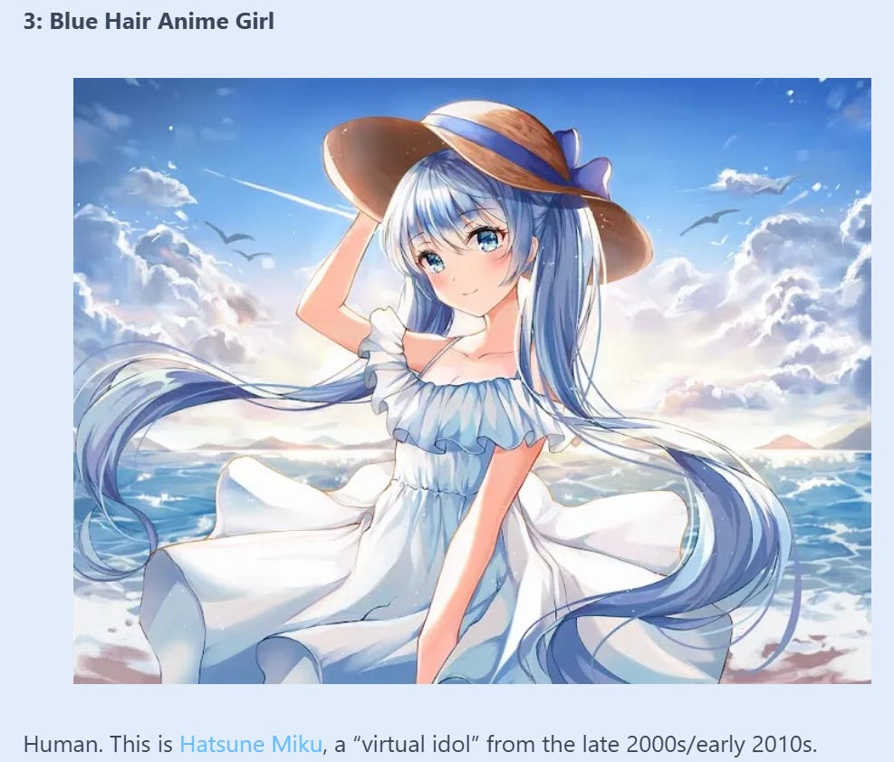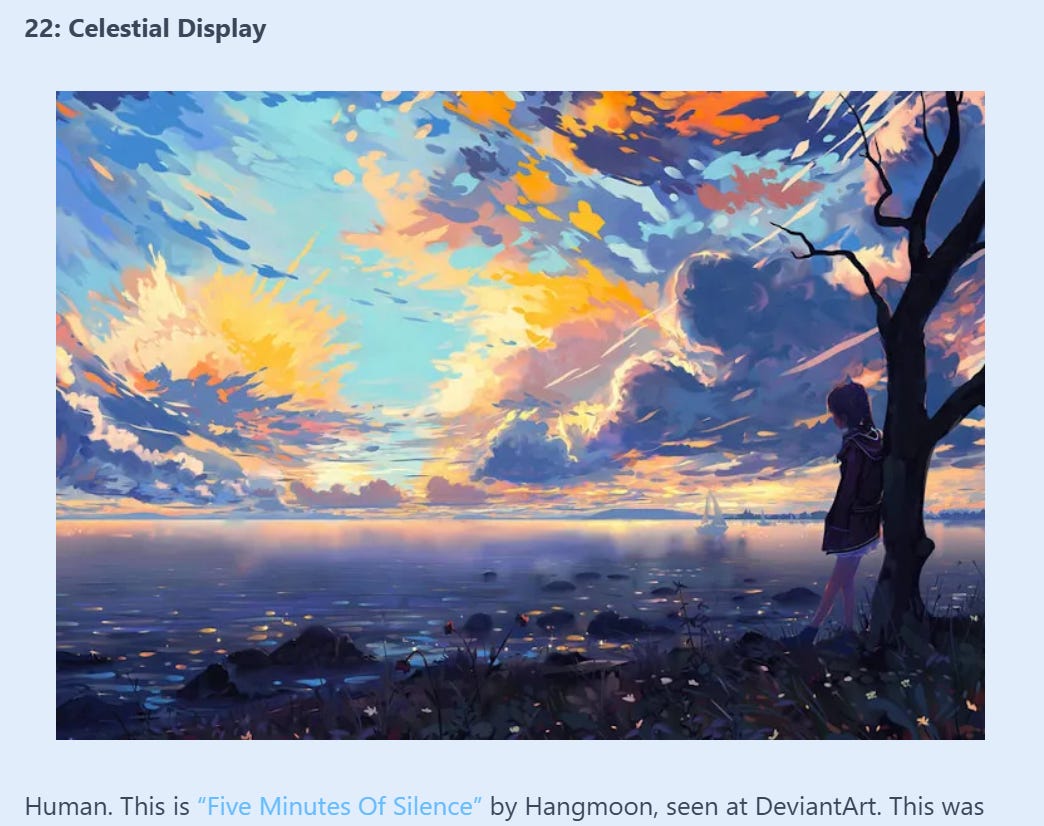 I correctly guessed the above “anime girl” as human-made—in part because there was a much poorer AI anime girl included in the test—but the inclusion of such art calls into question what the test is supposed to prove. Are there a lot of people who argue all AI images are of poorer quality than any art made by any human? Seems unlikely. Especially when we aren’t talking about actual works of human art, but small digital images of human art. A low-dpi jpg is not the same thing as, to pick one example used, a grand 13 x 17 foot oil on canvas painting.