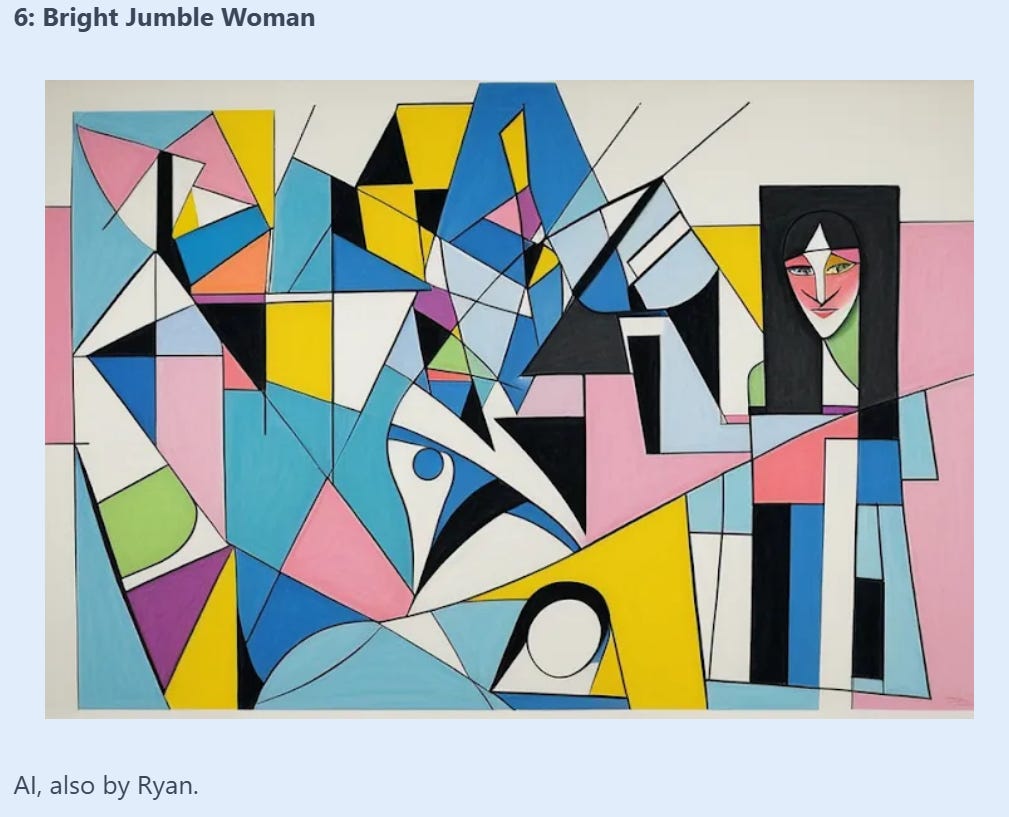 The ones I picked incorrectly were mostly human-made (and digitally illustrated) images that were, well, in my view not very good. I guess I’d gone in thinking we’d be comparing great works of human art to the best AI images.