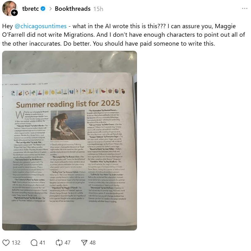Over the weekend, the Chicago Sun-Times—a storied and award-winning newspaper and longtime home of Roger Ebert—published a summer reading list. Almost all the books were fake. There is no Nightshade Market by Min Jin Lee, Boiling Point by Rebecca Makkai, The Last Algorithm by Andy Weir, or The Rainmakers by Percival Everett, among other invented titles. The article was not only generated by ChatGPT (or similar program), but clearly unedited. No one at the Chicago Sun-Times even bothered a cursory check. And not only the Sun-Times. The article, along with other seemingly AI-generated pieces, were syndicated in multiple newspapers across the country including the Philadelphia Inquirer.