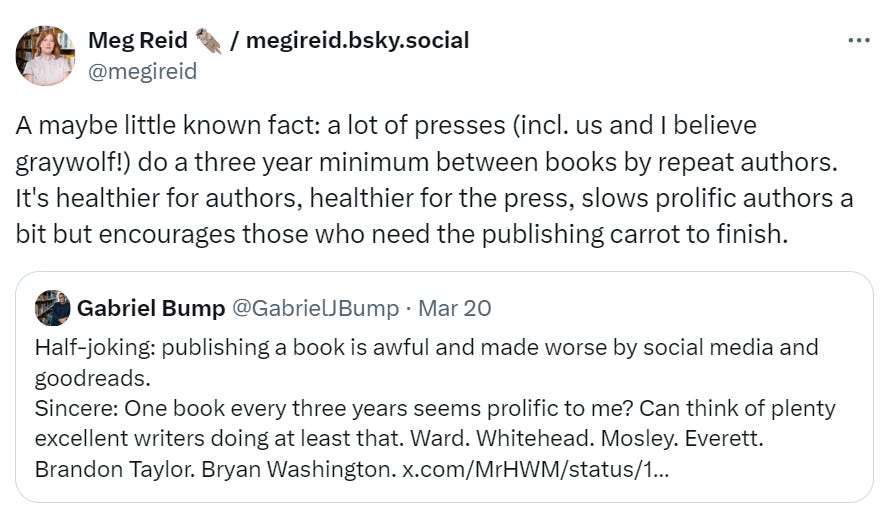 Obviously there are exceptions—Reid notes Graywolf didn’t apply the rule to Percival Everett—and in popular genre spaces this rule doesn’t seem to exist at all. But most authors don’t tend a large number of rabid fans who will buy any book an author puts out. Time helps with sales.