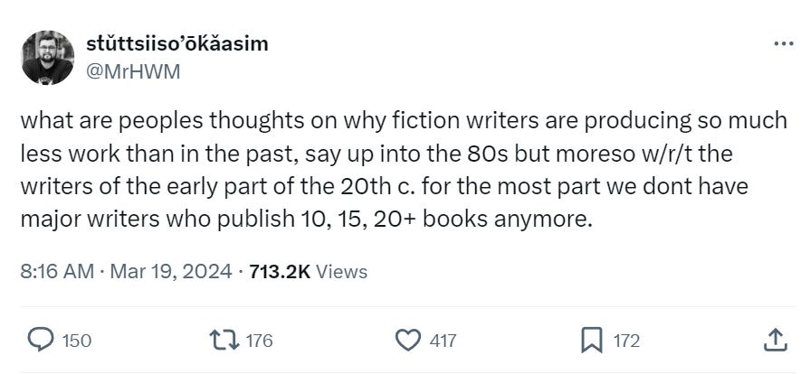 Academia also incentivizes publishing well rather than publishing a lot. University hiring committees tend to care more about prestige—awards, rave reviews, fellowships—than sales. And if one secures a tenure track job after, say, a highly regarded debut, then your economic incentive to publish might largely disappear even if your creative impulses are still there. (These were central points in the infamous “MFA vs. NYC” essay that spawned many bitter discourses.)