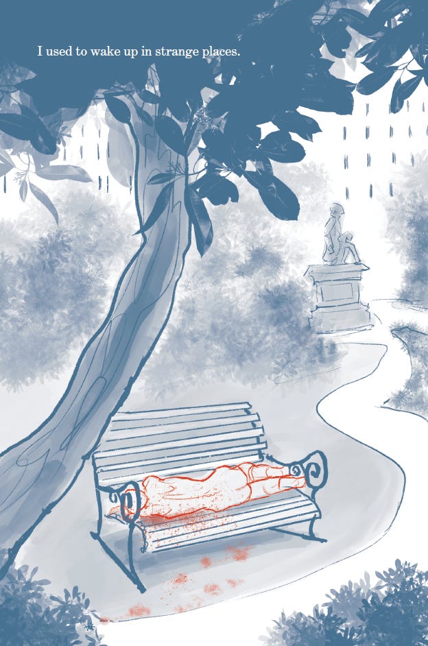 The three tales visually cohere with your illustrations, but I was also interested in the stylistic difference between them. For example, the use of colors. The first story is almost entirely blue and red plus some flashes of yellow. The second story uses black lines with blue and white coloring. And the last story has a broader and brighter palette. There are other differences too, such as clean or fuzzy linework. I’m curious how you settled on these different visual styles. Did you know going into a story what color palette and linework you wanted to use? Or do those decisions get made during drafting?