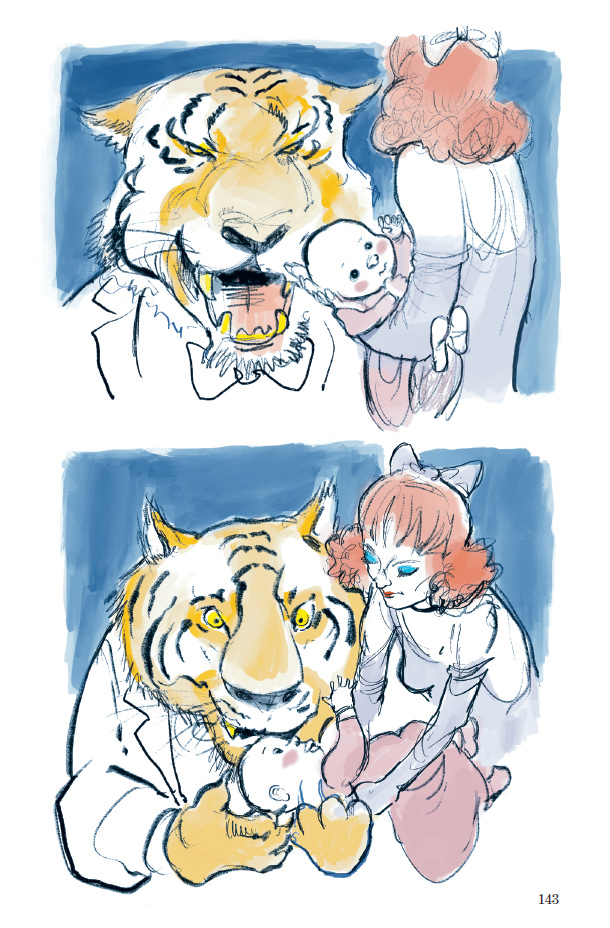 In “The Tiger in Vogue,” Ferry’s original story begins and ends inside a music hall. I wanted to extend this, to give more information about the protagonist’s life and more about the social conditions outside the music hall, of which the tiger itself—with its barely-constrained destructive power—is symbolic. So, respecting the original text, I have several “silent” pages in the world outside the music all before the text begins and, at the end, several more. Those are my additions to the original story and, because I didn’t want to violate Ferry’s text, they are told silently.