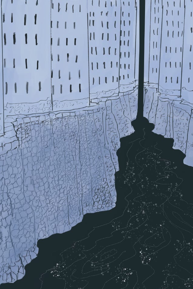 The second story—which you wrote as well as illustrated—creates its nightmarish reality in part by using askew angles and large swaths of black. It works fantastically to conjure the eerie atmosphere of the story. And it reminded me of German Expressionist films with heir Dutch angles and impossible, theatrical sets. Was that an influence?