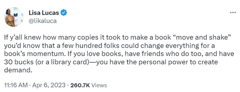 As Lucas said, a few hundred people boosting a book they admire can do a whole lot to shake up a books entire trajectory. And that doesn’t just mean reviewing. If we’re keeping it real, most traditional book reviews don’t get that many reads. Often it would be far better to have someone with a big social media account simply tweet or instagram about your book than to have them traditionally review it.