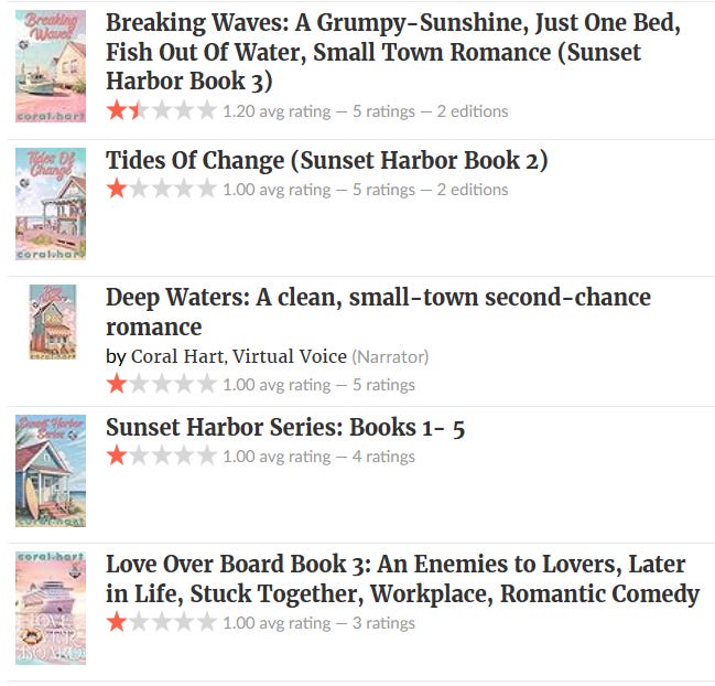 As for Coral Hart, I don’t have access to her bank statements. Maybe she’s earned six figures just on AI books. But a quick look at the Amazon and Goodreads pages of her books show they have almost no ratings—and the few reviews that exist tend to be 1-star “this is AI slop!” comments posted after the NYT article. Can anyone sell 50,000 copies, even spread across 200 titles, and receive no ratings or reviews? The books seem to be part of the Kindle Unlimited service, so it is possible Hart is counting a “sale” as anyone who downloads the book for free. I’ve also seen it speculated that since Hart is South African the “six figures” could refer to South African rands, which are worth a fraction of US dollars. (100k rands = about $6,200.)