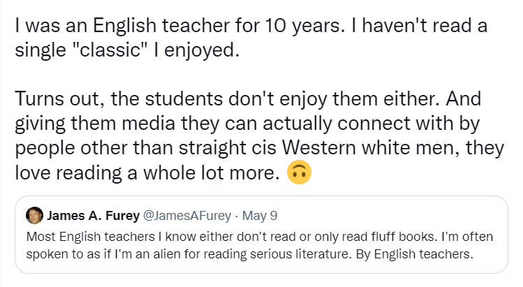 Their argument (if you can call it that) also sidesteps how, yes, sometimes teens *are* deeply annoyed by classics because of the class/race/gender dynamics they contain. But they should still be given the tools to examine why that is, and determine for THEMSELVES what themes and character dynamics are irksome, which are an essential part of the genre and which are an essential part of the author’s worldview.
