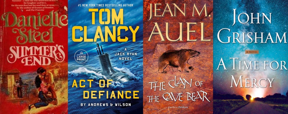 Gather round young’uns and let me tell you about the olden days. When I was growing up in the 80s and 90s, the closest town had a couple (mostly used) bookstores. But bookstores weren’t where most books were sold. They were sold in the supermarket aisles, big box stores, and airports—thus the “airport novel.” You browsed novels while stocking up on apples and Advil. The largest stock of books in my town was at Sam’s Club sandwiched between the bulk jars of peanut butter and tables of three-pack t-shirts. You probably don’t need me to tell you that the kind of books stocked in these locations weren’t highbrow literary fiction, obscure postmodernist tomes, or lyrical short story collections. They were big fat commercial fiction novels with the authors’ names embossed in larger letters than the titles.