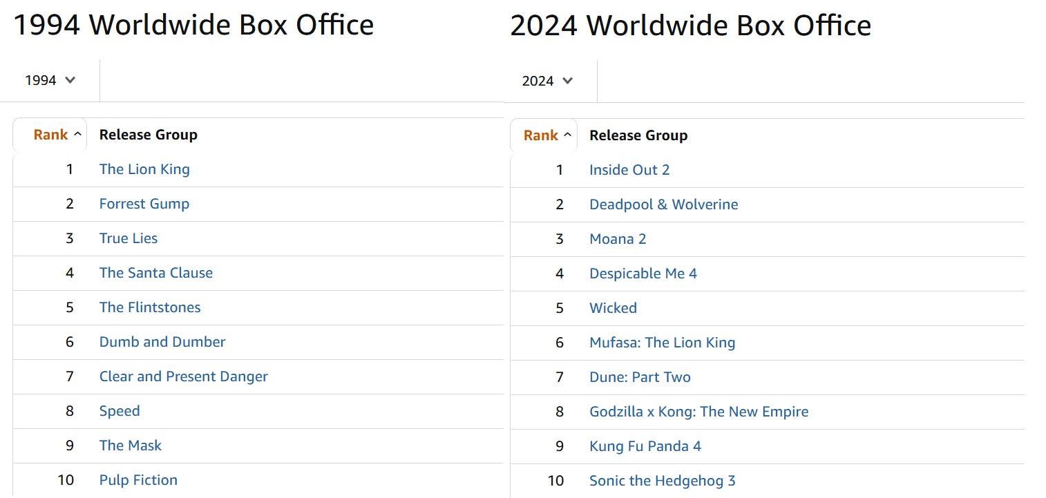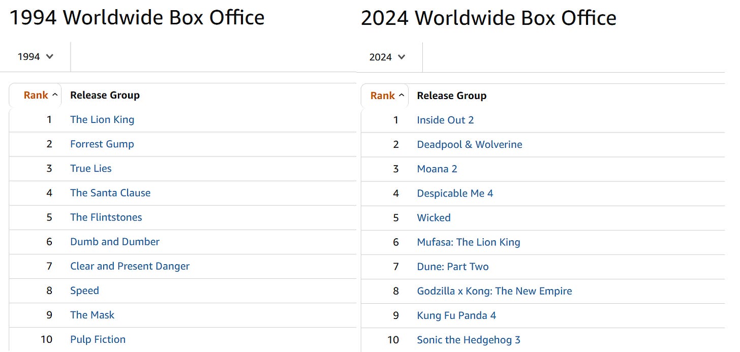 Ted Gioia recently noted that “Back in 2000, 80% of movie revenues came from original ideas. But this has now totally flip-flopped. Today 80% of the movie business is built on old ideas—remakes, and spin-offs, and various other brand extensions.” Gioia blames this on studio execs and says audiences are rebelling but… what evidence is there of that? 10/10 of last year’s top grossing films were sequels, reboots, or reimaginings. In this environment, a movie like Wicked—an adaptation of a hit broadway play adapted from a popular novel that reimagined a hit film that was adapted from a popular book—feels like a breath of fresh air just because it isn’t a sequel. (The sequel will be released later this year.)