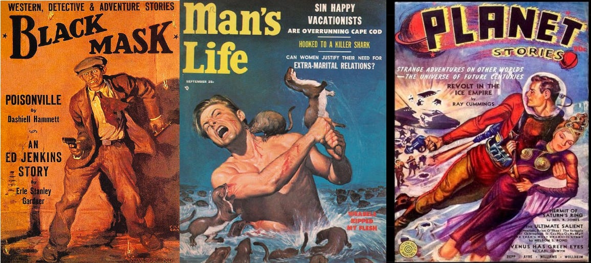 Anyway, the central point is that the rise of brand-name mass market commercial fiction is not necessarily the same thing as the decline of serious literary readership. Did the type of readers once buying Phillip Roth and Flannery O’Connor switch suddenly to Tom Clancy and Danielle Steel? Or are those simply different readers? For example, the type of readers who in a previous era bought pulp magazines instead of novels at all?