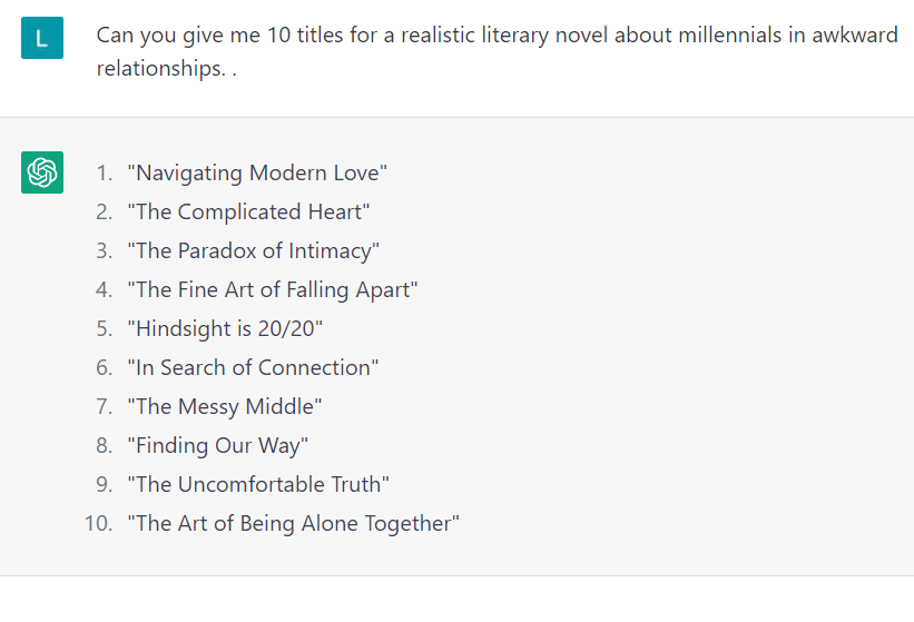There is a major caveat to add here, which is that the line between what counts as human-produced will get blurry. Computers already assist artists in many ways and it’s easy to imagine AI tools that would benefit authors greatly without compromising artistic integrity at all. For example, swapping a passage from first person POV to third person POV is—at least on the initial pass—a bunch of robotic work that a future AI program could do in an instant. As an author, I’d kill for that. And if I go to ChatGPT and ask it to spit a bunch of titles at me, they might spark ideas even if I use none… although my first attempt didn’t yield much of interest: