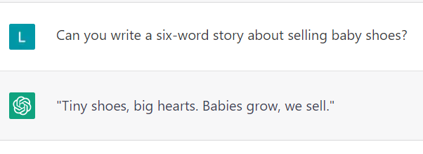 ChatGPT also is quite bad at following instructions. I gave it a fairly generic creative writing prompt to write about an old man sitting by a lake without mentioning the man or the lake. Its first sentence opened “The old man sat by the water’s edge.” Whoops. Worse, I asked for a six-word story about baby shoes and was given an eight-word store slogan: