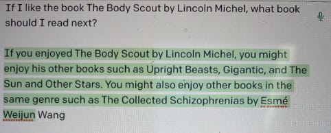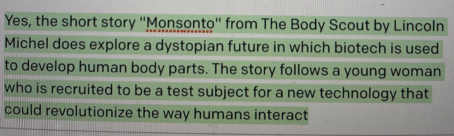 The Bart comparison seems apt as ChatGPT is lazy. Well, it’s not lazy really as it isn’t sentient, but it mimics the process of a lazy writer. Before I played in ChatGPT myself, a friend who knows I dislike AI art dm’d me a conversation about my novel, The Body Scout, which the program dubs a “collection of short stories” and then simply… invents an example story with a misspelled title?