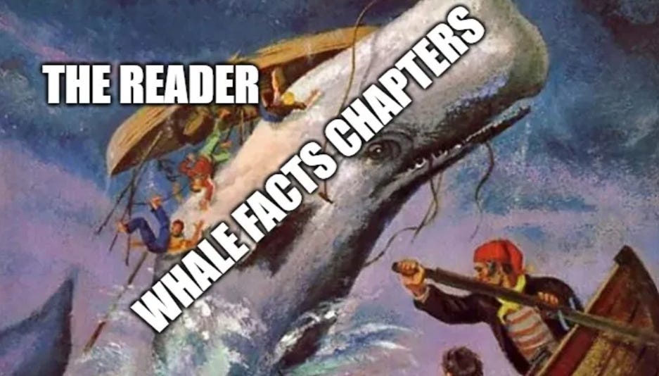 Moby-Dick resurfaced in the discourse this week, and whenever Melville’s leviathan breaches the timeline there are complaints that the novel is ruined by chapters of “whale facts” that “distract from the plot.” Seeing these grumbles again made me think about, whew, I wish there were more whale facts in contemporary novels!
